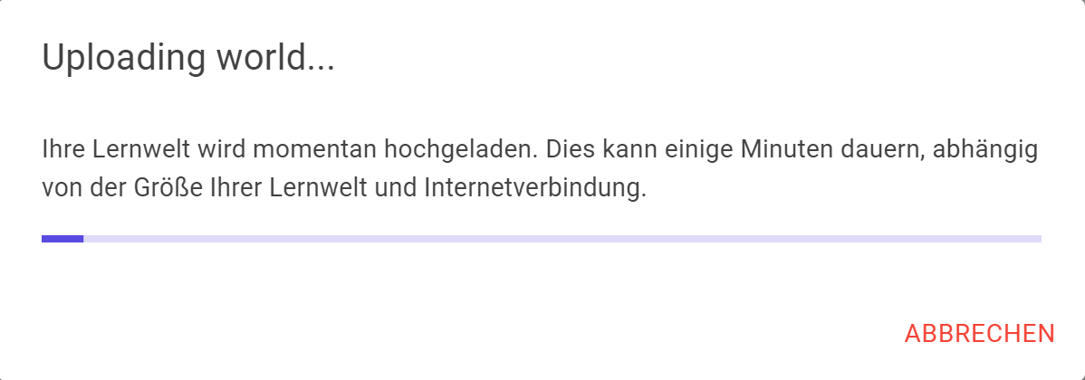 Vorhandene Lernwelt ersetzen: Drücken Sie auf den Button Ja, um die ausgewählte Lernwelt in Moodle hochzuladen. Drücken Sie alternativ den Button Abbrechen, um den Bestätigungsdialog ohne Hochladen zu beenden.